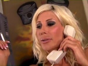 Blonde Sekretärin Michelle Wet schraubt ein Sexspielzeug in einen zerrissenen Schlauch und High Heels